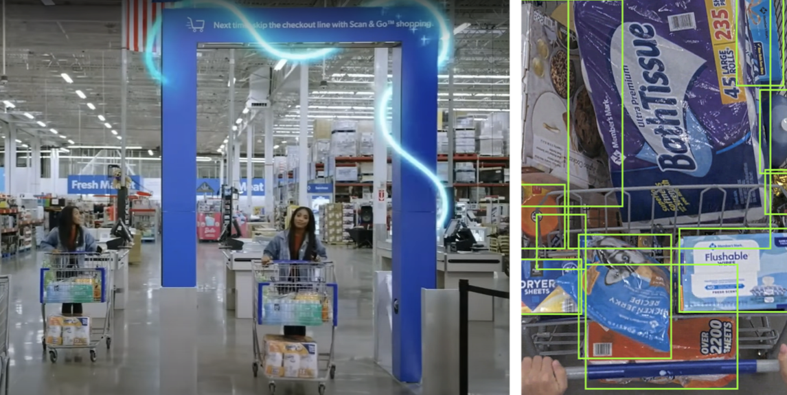 회원제 매장 샘스클럽에 도입된 자동 체크아웃 시스템은 컴퓨터 비전과 AI를 활용해 카트 내 제품을 자동 인식, 결제 여부를 확인합니다.