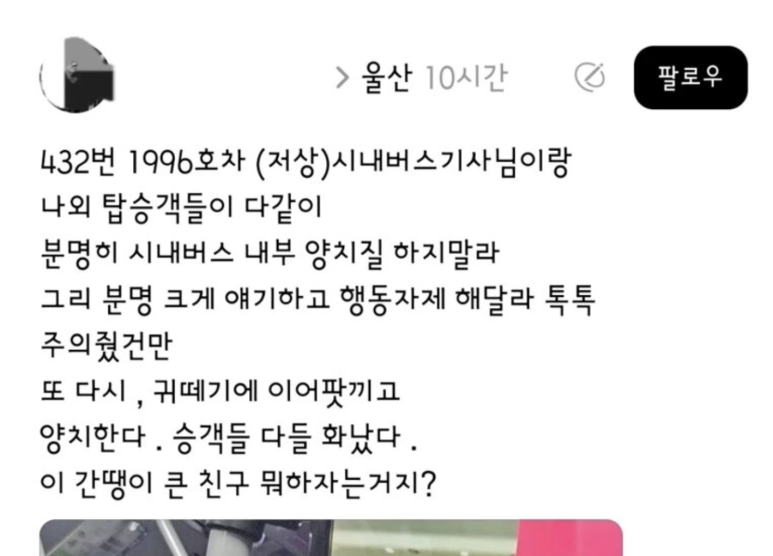 지난 21일, 한 시민 A씨가 자신의 SNS에 울산 시내버스에서 있었던 사건을 공유했습니다. A씨에 따르면, *남학생은 이어폰을 낀 채 승객과 버스 기사의 경고를 무시하고 계속해서 양치를 했으며,* 스마트폰을 쳐다보며 아무렇지 않게 행동을 이어갔습니다.
