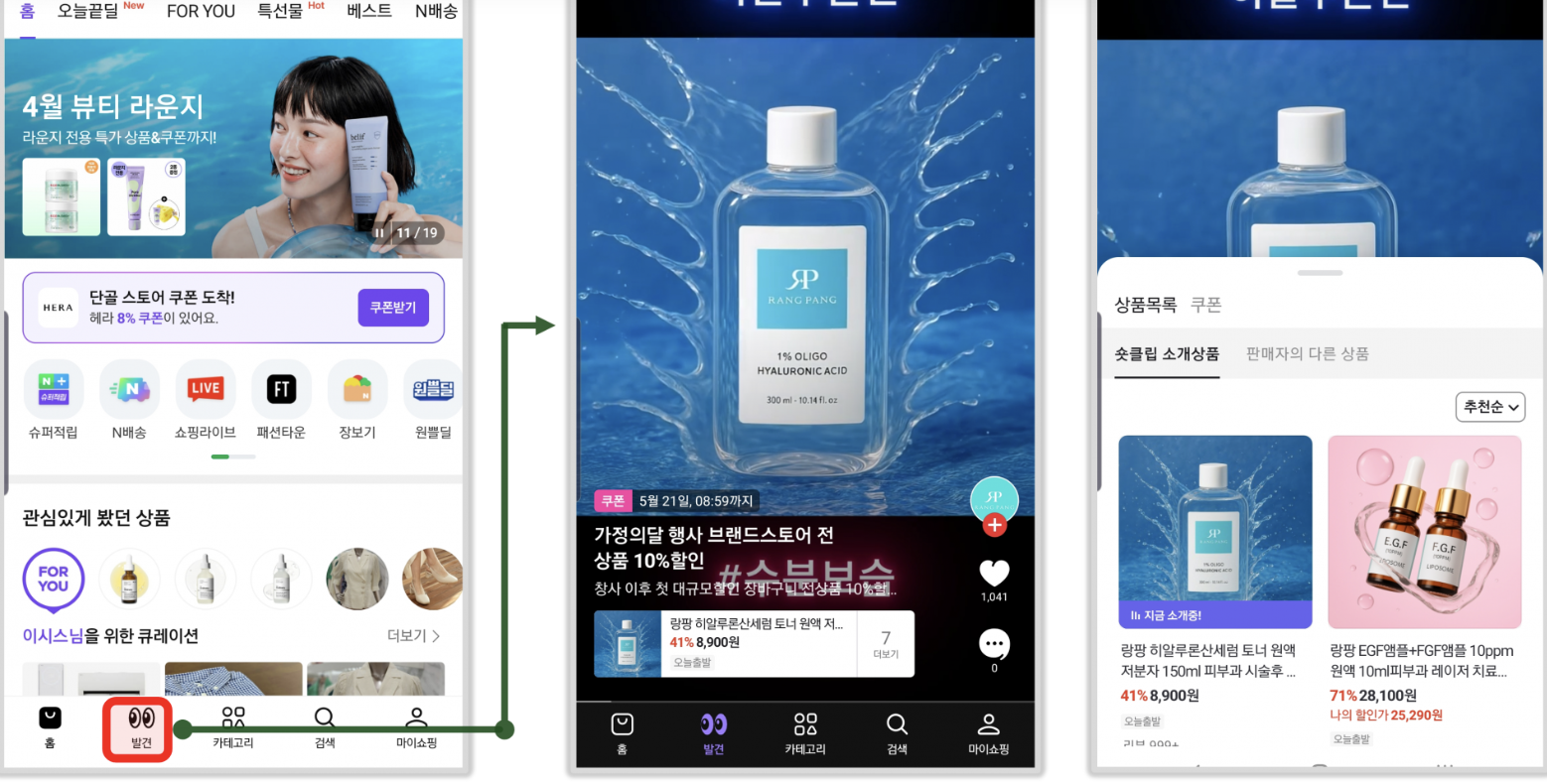 네이버는 2025년 3월 ‘네이버플러스 스토어’라는 별도 앱을 론칭하며 ‘발견’ 탭을 도입했습니다. 이는 숏폼 콘텐츠 기반의 탐색형 쇼핑을 유도하기 위한 시도입니다.