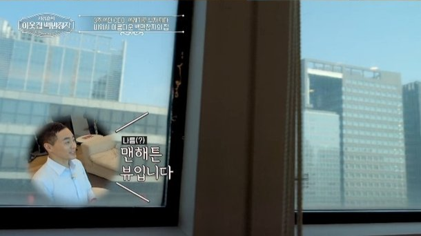 거실 창밖을 바라본 서장훈은 "높아서 밖이 보일 거라고 생각했는데 앞을 무가 막고 있다"며 다소 당황한 표정을 지었습니다. 이에 집주인 김정빈은 "나름 맨해튼 뷰"라고 재치 있게 받아쳤고, 서장훈은 집주인의 유머를 존중하며 넘겼습니다.