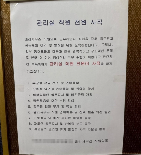 7일 연합뉴스에 따르면, 울산의 한 아파트 엘리베이터에는 '관리실 직원 전원 사직'이라는 제목의 공지가 붙었습니다. 해당 공지에는 일부 동대표들의 반복적이고 구조적인 문제로 인해 정상적인 직무 수행이 불가능해졌다는 사직 사유가 명시되어 있었습니다.