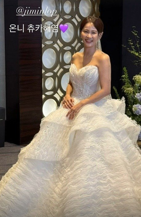 김지민은 예식장에 도착해 큰 벤에서 내릴 때 어깨선이 사선으로 감싸진 드레스를 입고 모습을 드러냈습니다. 단정하면서도 우아한 디자인이 눈길을 끌었습니다.