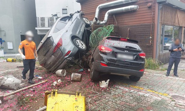부산 해운대경찰서에서 제공한 사고 현장 사진에 따르면, 사고 차량은 정면과 측면이 심하게 찌그러진 채 멈춰 있었고, 식당 외벽은 큰 충격을 받은 흔적이 뚜렷했습니다.